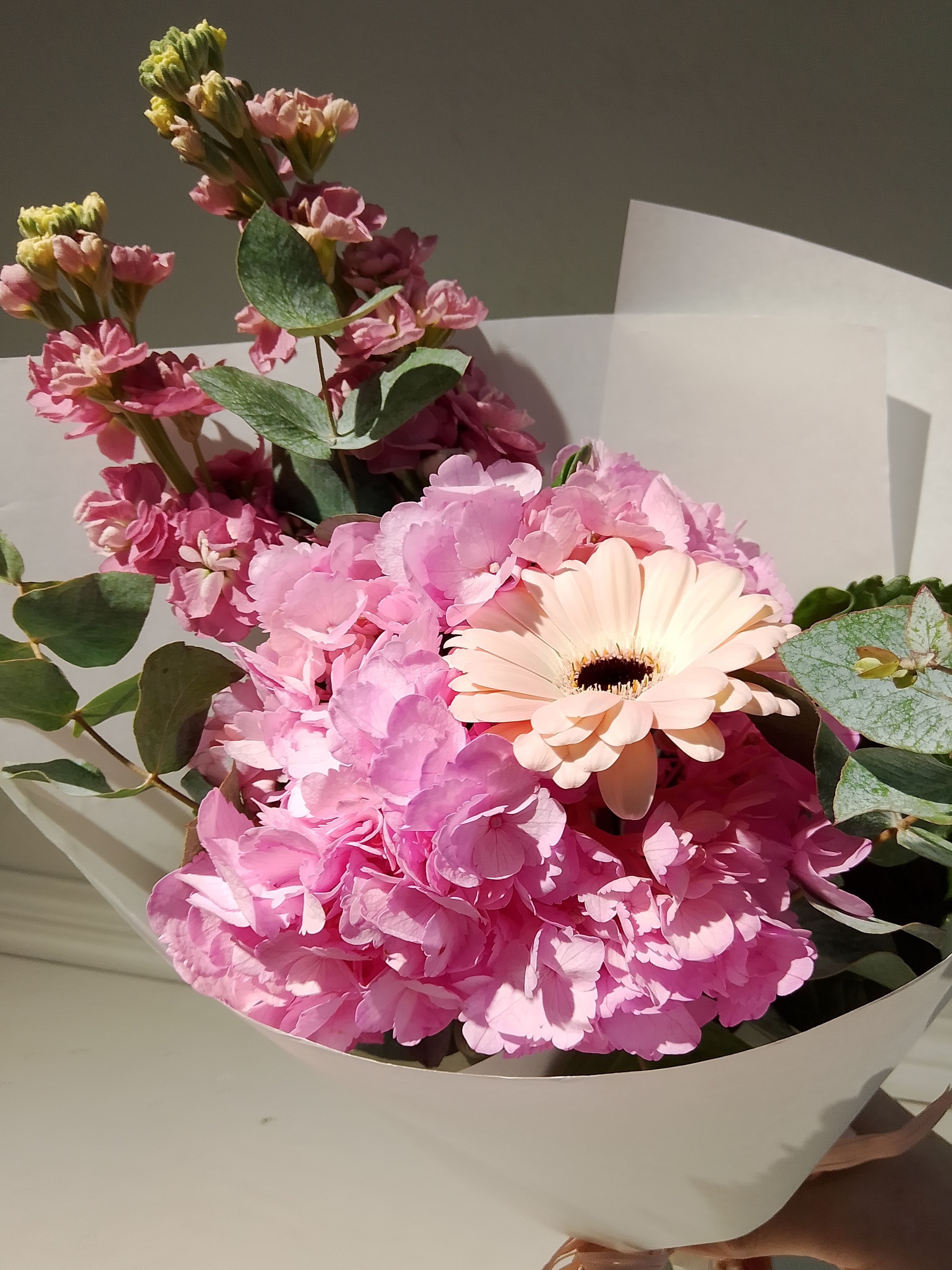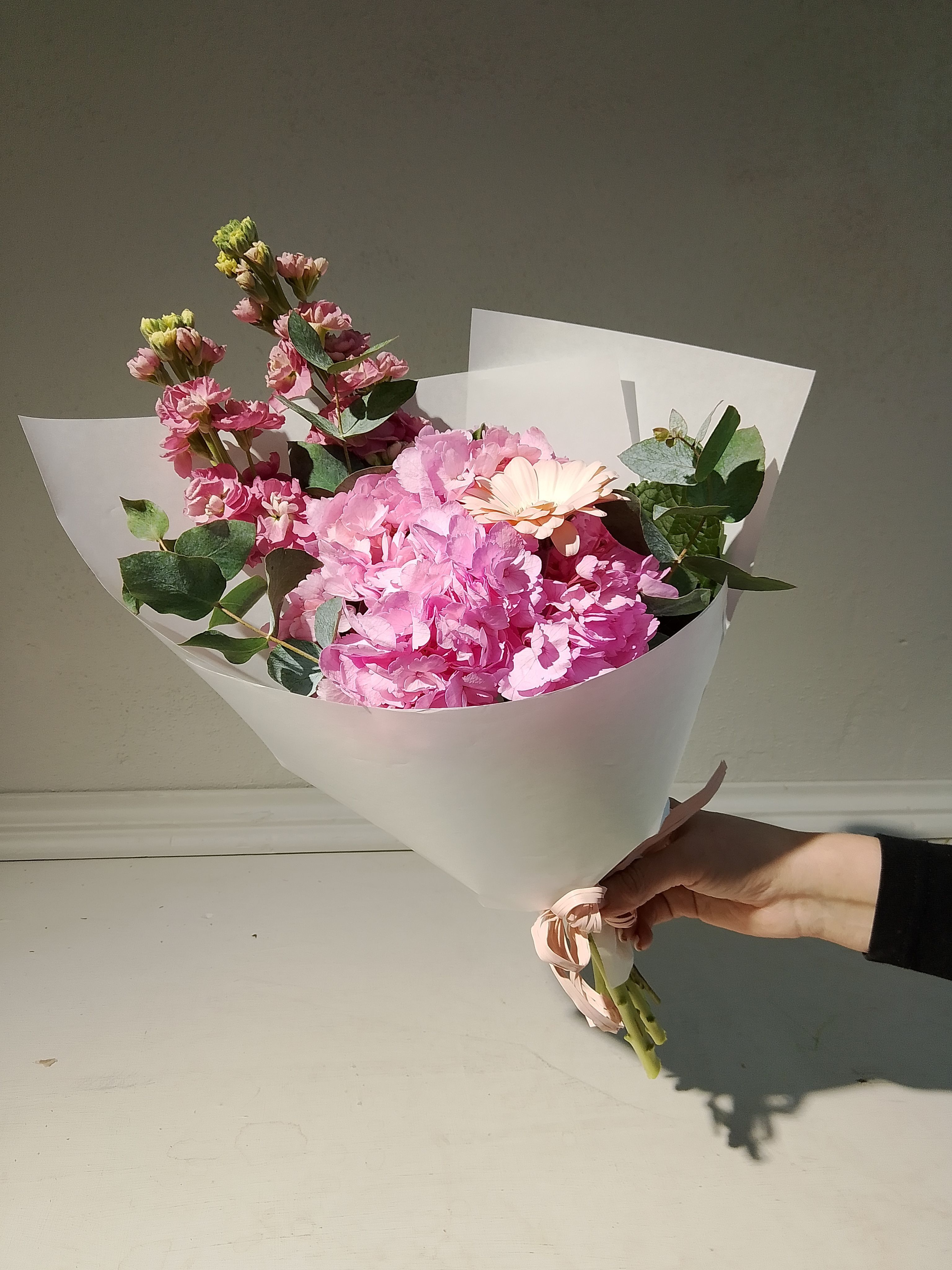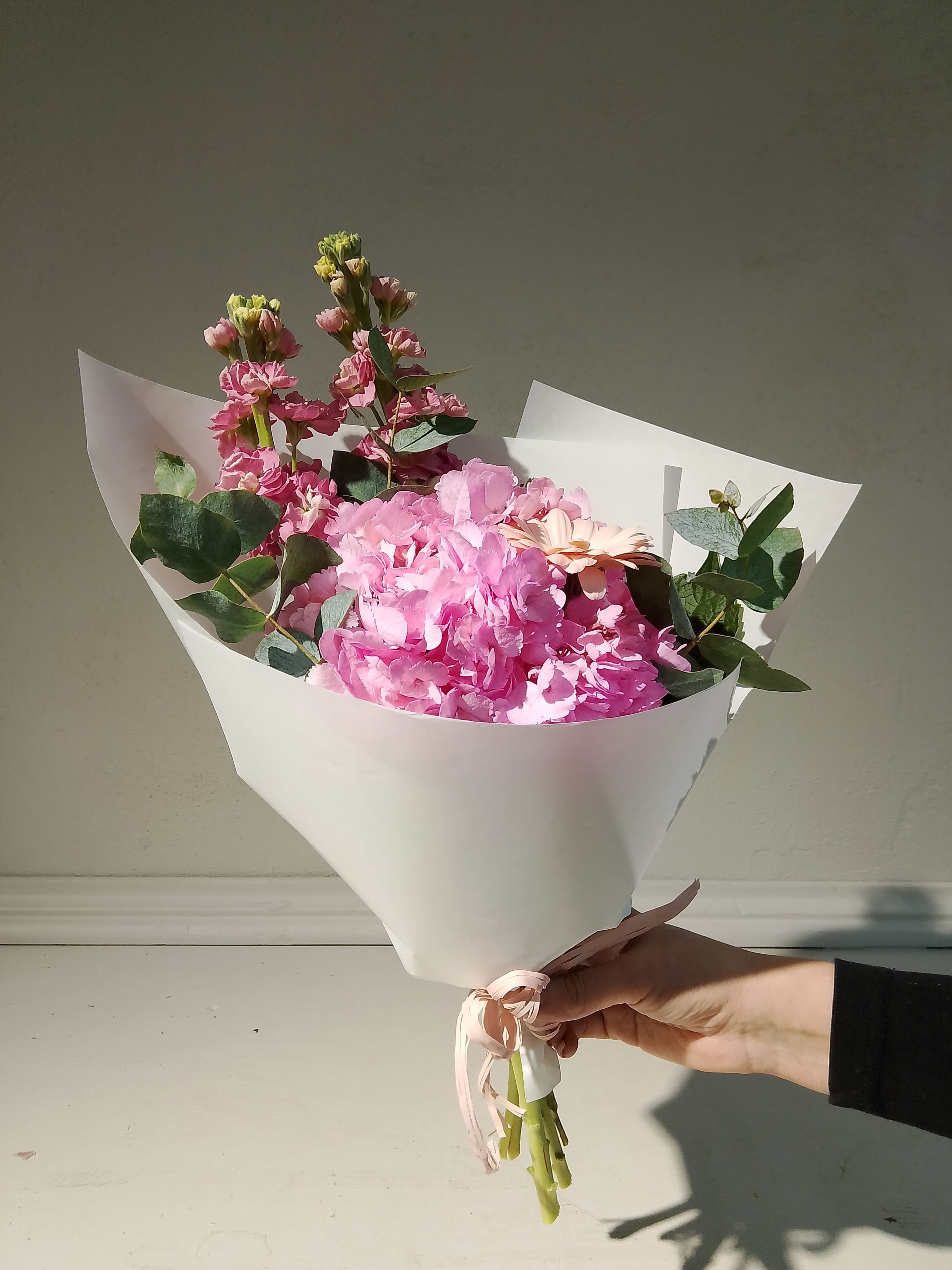 Букет из гортензии, маттиолы, гермини, эвкалипта, упаковка, лента